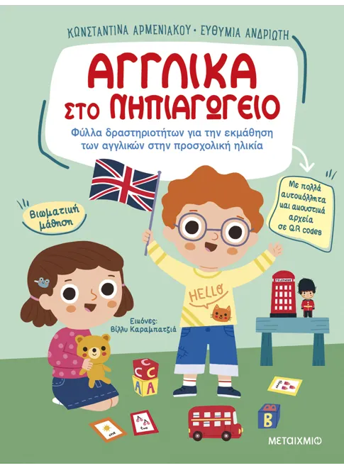 Το κατάλληλο υλικό για βιωματική μάθηση και τα πρώτα βήματα στην κατάκτηση της αγγλικής γλώσσας από τα μικρά παιδιά. Με βάση τις οδηγίες του Υπουργείου για την εισαγωγή της αγγλικής γλώσσας στο Νηπιαγωγείο.