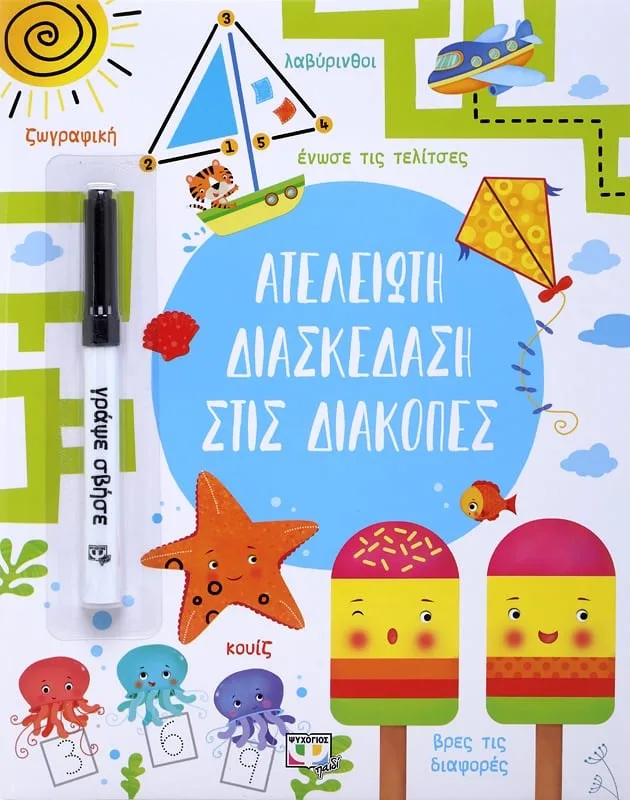 Αυτό το διασκεδαστικό βιβλίο θα συντροφεύσει τα μικρά παιδιά στις διακοπές και θα τα βοηθήσει να αναπτύξουν την ικανότητά τους να μετρούν, να παρατηρούν και να χειρίζονται τον μαρκαδόρο, ώστε να ενδυναμώσουν τη λεπτή κινητικότητά τους.