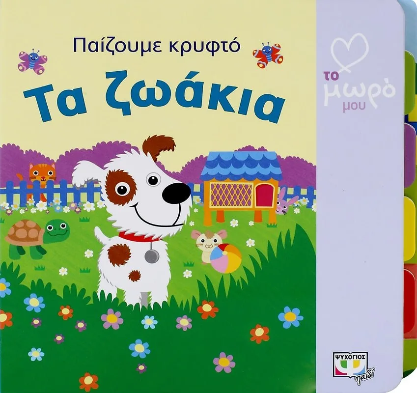 Έλα κι εσύ να παίξεις κρυφτό με το σκυλάκι και τα άλλα κατοικίδια. Βρες πού κρύβονται το γατάκι, το χαμστεράκι, το κουνελάκι και η χελώνα. Μπορείς να θυμηθείς άραγε ποιο ζωάκι βρίσκεται κάτω από κάθε σελίδα;