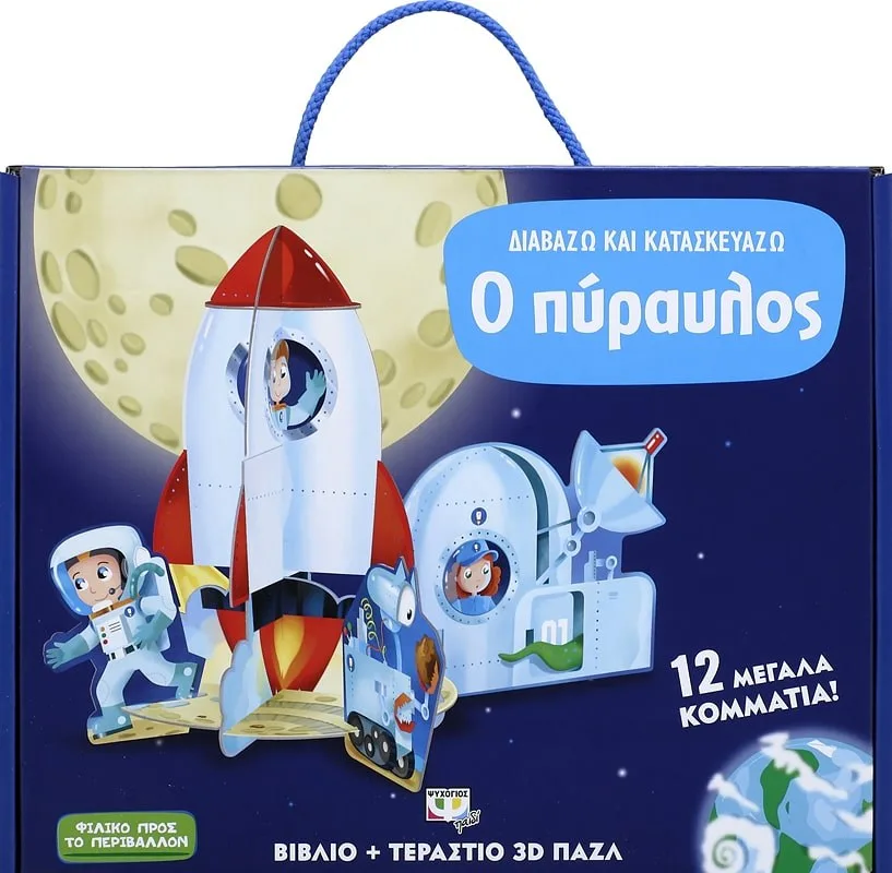 Φόρεσε τη διαστηµική στολή σου, βάλε µπρος τις µηχανές του πυραύλου και απογειώσου σε ένα ταξίδι εξερεύνησης του Διαστήµατος! Συναρµολόγησε το τρισδιάστατο παζλ για να φτιάξεις έναν φανταστικό πύραυλο που θα σε ταξιδέψει ως το φεγγάρι! Επίσης, µε το υπέροχο βιβλιαράκι µπορείς να παρατηρήσεις τα αστέρια και τους πλανήτες, να κάνεις την έρευνά σου και να ταξιδέψεις µε ένα ροµπότ-εξερευνητή!