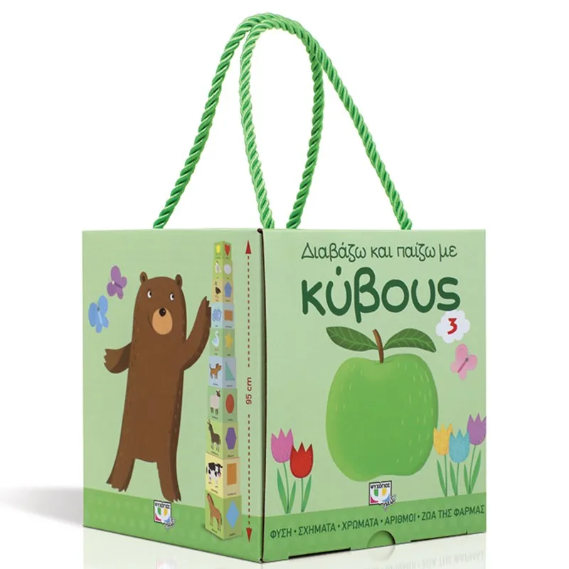 Διαβάστε το βιβλιαράκι που θα βρείτε στο κουτί και τοποθετήστε µαζί µε το παιδί σας τους 10 κύβους, τον έναν πάνω στον άλλον, για να φτιάξετε έναν εντυπωσιακό πύργο! Το µικρό σας θα μάθει τα σχήµατα, τα χρώματα και τους αριθµούς, και θα ανακαλύψει τη φύση και τα ζώα της φάρμας.