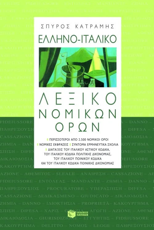 Το πρώτο Ελληνο-Ιταλικό Λεξικό Νομικών Όρων είναι ένα περιεκτικό και εύχρηστο λεξικό νομικής ορολογίας που απευθύνεται κατά κύριο λόγο, αλλά όχι μόνο, σε νομικούς. Το Λεξικό περιλαμβάνει πάνω από 2.500 νομικούς όρους και εκφράσεις του νομικού λόγου και παρουσιάζει δύο πρωτοτυπίες σε σχέση με τα υπάρχοντα νομικά λεξικά. Πρώτον, περιέχει σύντομα σχόλια συγκριτικού δικαίου, ιδίως όπου οι ιταλικοί όροι έχουν περιεχόμενο ουσιωδώς διαφορετικό σε σχέση με τους «αντίστοιχους» ελληνικούς, έτσι ώστε να μην δημιουργούνται παρερμηνείες λόγω της μη απόλυτης εννοιολογικής αντιστοιχίας. Δεύτερον, παρατίθενται αυτούσιες ορισμένες διατάξεις του ιταλικού δικαίου (όπως π.χ. του ιταλικού Αστικού Κώδικα, του ιταλικού Κώδικα Πολιτικής Δικονομίας, του ιταλικού Ποινικού Κώδικα). Με τον τρόπο αυτό ο χρήστης του Λεξικού έχει μια πληρέστερη εικόνα της ιταλικής νομικής γλώσσας.