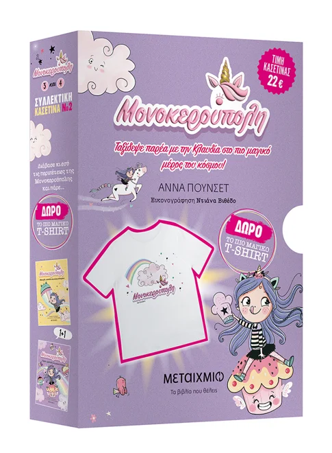 Μια κασετίνα που περιλαμβάνει τον τρίτο και τον τέταρτο τόμο της σειράς Μονοκερούπολη και δώρο ένα μπλουζάκι με στάμπα το λογότυπο της σειράς.