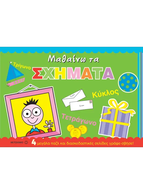 Βιβλιοπάζλ που βοηθά το παιδί να μάθει τα σχήματα και να εξασκηθεί στη γραφή παίζοντας και διασκεδάζοντας.