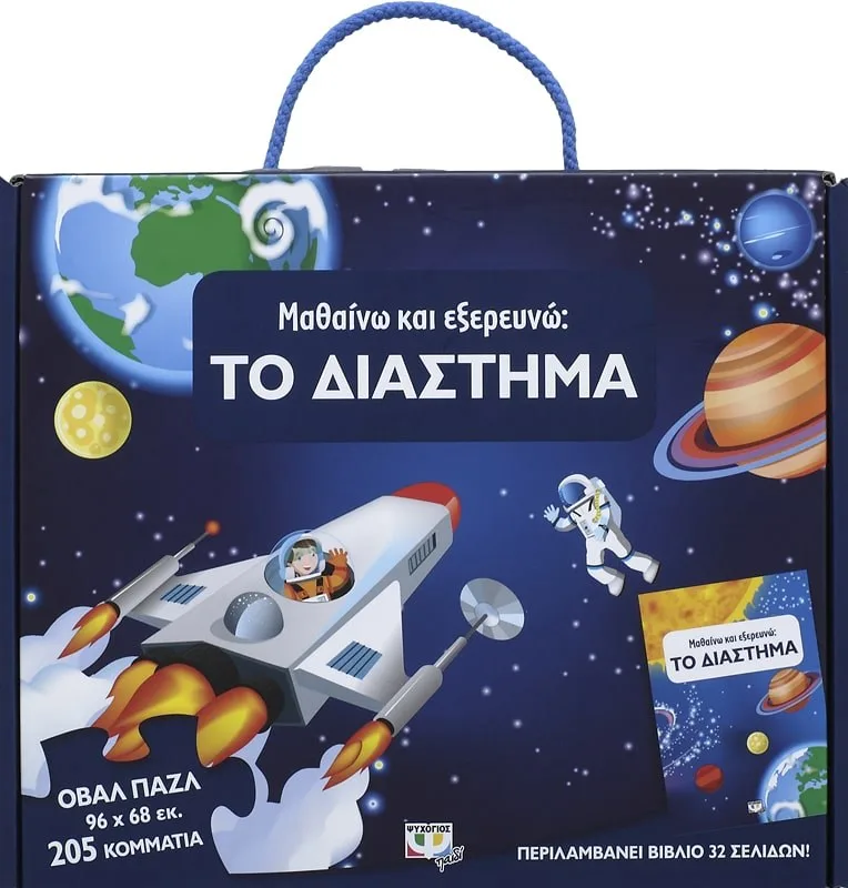 Ταξίδεψε στο Διάστημα σαν ένας πραγματικός αστροναύτης! Διάβασε το βιβλίο και μάθε πώς δημιουργήθηκε το Σύμπαν, πόσο γρήγορα ταξιδεύει το φως από τον Ήλιο στη Γη, πόσο μεγάλος είναι ο Γαλαξίας μας και άλλα πολλά! Ύστερα, δοκίμασε τη μνήμη σου ενώνοντας τα κομμάτια του παζλ!