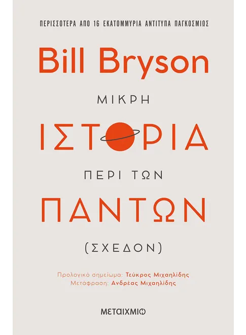 Στο κλασικό αυτό έργο εκλαϊκευμένης επιστήμης, ο Bill Bryson κατορθώνει το φαινομενικά ακατόρθωτο: να μας βοηθήσει να κατανοήσουμε τον κόσμο, παρουσιάζοντας τις σύγχρονες θεωρίες της επιστήμης με τον πιο προσιτό και διασκεδαστικό τρόπο. Με άφθονο χιούμορ αλλά και αξιοσημείωτη σαφήνεια, μας παρασύρει σε ένα συναρπαστικό ταξίδι από τη γέννηση και την εξέλιξη του σύμπαντος μέχρι τη δημιουργία του πολιτισμού και τις νεότερες ανακαλύψεις. Και αφού, χάρη στις παρομοιώσεις, τις ιστορικές και προσωπικές αναφορές, μας διαφωτίζει ακόμα και για δύσκολα θέματα της αστρονομίας, της φυσικής, της χημείας και των άλλων θετικών επιστημών, δεν σταματά να υπενθυμίζει ότι, παρά τη ραγδαία επιστημονική εξέλιξη, είναι πολλά τα ερωτήματα που παραμένουν αναπάντητα.