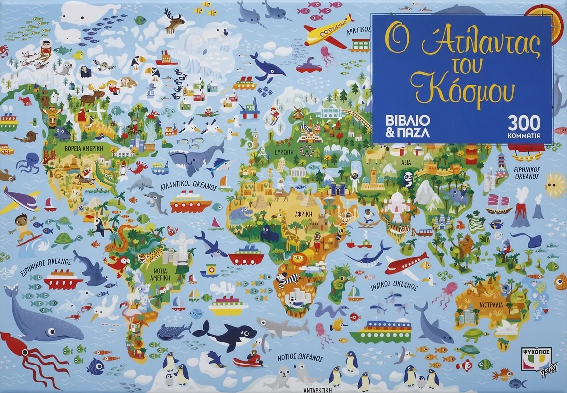 Ποιος είπε ότι η γεωγραφία είναι βαρετή; Ανακαλύψτε µέσα σε αυτό το κουτί ένα απίθανο παζλ 300 κοµµατιών µε τον παγκόσµιο χάρτη και έναν εικονογραφηµένο άτλαντα για να µάθετε τα διασηµότερα αξιοθέατα του κόσµου. Βρείτε πληροφορίες για τη χλωρίδα και την πανίδα κάθε ηπείρου και γνωρίστε τις σηµαίες 195 χωρών!