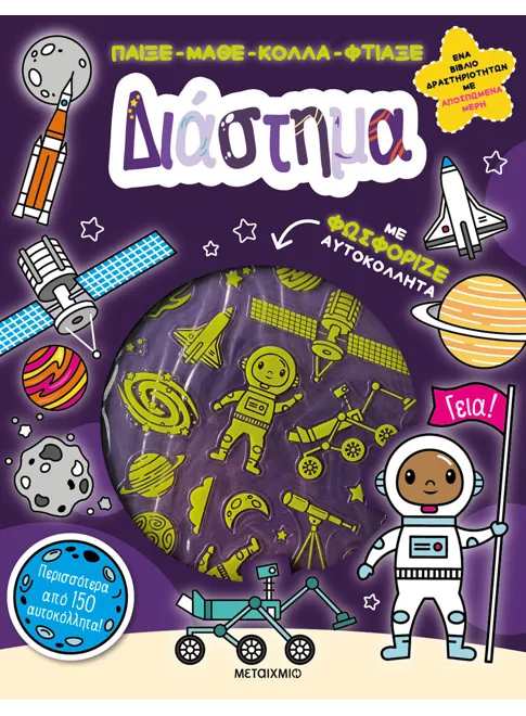 Ένα υπέροχο βιβλίο που περιλαμβάνει: Ένα σωρό συναρπαστικές πληροφορίες για το Διάστημα, ασκήσεις και δραστηριότητες, 150 πολύχρωμα και 30 φωσφοριζέ αυτοκόλλητα, καθώς και 16 σελίδες με αποσπώμενα μέρη για να φτιάξεις ένα επιτραπέζιο παιχνίδι με κάρτες και όμορφες κατασκευές.