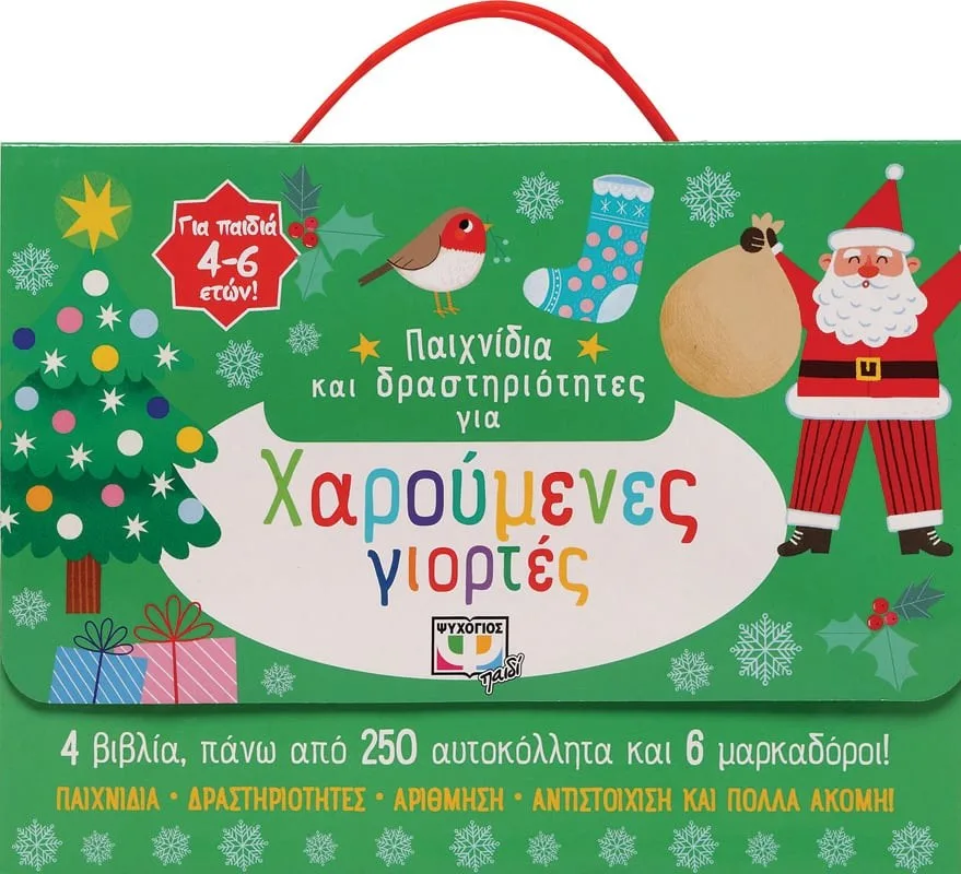 Ανακαλύψτε μέσα σε αυτό το βαλιτσάκι 4 υπέροχα βιβλιαράκια με πολλές διασκεδαστικές γιορτινές δραστηριότητες, σελίδες με πάνω από 250 αυτοκόλλητα και 6 μαρκαδόρους σε απίθανα χρώματα. Ενίσχυση της λεπτής κινητικότητας, των δεξιοτήτων της γραφής, της ανάγνωσης και της αριθμητικής.
