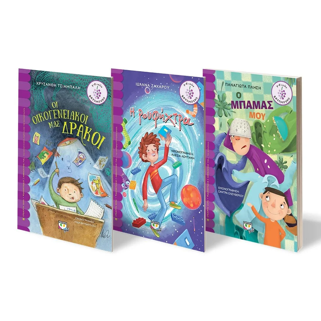 ΟΙ ΟΙΚΟΓΕΝΕΙΑΚΟΙ ΜΑΣ ΔΡΑΚΟΙH πρόταση της κυρίας Πέρσας στους μαθητές της να συμμετάσχουν σε έναν διαγωνισμό ζωγραφικής με θέμα τους δράκους ενθουσιάζει τον Γιάννη. Είναι έτοιμος να ζωγραφίσει τον πιο άγριο και φοβερό δράκο και να διεκδικήσει το έπαθλο, όταν βλέπει τους εκπληκτικούς δράκους δυο συμμαθητών του. Οι γονείς και τα αδέλφια τους είχαν βάλει όλη τους την τέχνη. Ο Γιάννης είναι έτοιμος να τα παρατήσει… Όμως, έχει και εκείνος αδελφή και γονείς! Θα καταφέρει κάποιος από την οικογένειά του να ζωγραφίσει έναν δράκο όπως τον φαντάζεται ο Γιάννης, ώστε να πάρει μέρος στον διαγωνισμό; Μια ιστορία για τη δύναμη της οικογένειας και την αξία της αυτοεκτίμησης και της ατομικής προσπάθειας.Η ΡΟΥΦΗΧΤΡΑΣτο δωμάτιο του Οδυσσέα συμβαίνουν παράξενα πράγματα. Αντικείμενα εξαφανίζονται μυστηριωδώς στα καλά καθούμενα, και άλλες φορές εμφανίζονται από το πουθενά. Η μαμά του πιστεύει ότι είναι απλώς ακατάστατος, αλλά ο Οδυσσέας ξέρει την αλήθεια…Κάπου στο σύμπαν υπάρχει μια πελώρια ρουφήχτρα που ρουφάει και εξαφανίζει ό,τι της αρέσει. Ο Οδυσσέας μοιράζεται το μυστικό του με τον φίλο του τον Νικόλα, και οι δυο μαζί προσπαθούν να λύσουν το μυστήριο. Μέχρι που μια μέρα ο Οδυσσέας βρίσκει ένα περίεργο σημείωμα από το σύμπαν, και τα πράγματα μπερδεύονται ακόμη περισσότερο…Ο ΜΠΑΜΑΣ ΜΟΥΠώς είναι άραγε να ζουν δυο παιδιά μόνο με τον μπαμπά τους; Ο ήρωας της ιστορίας μας διηγείται οικογενειακές στιγμές δοσμένες με χιούμορ, που δείχνουν πόσο ξεχωριστή είναι η οικογένειά του.