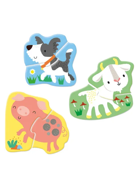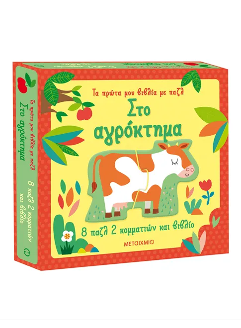 Ένα όμορφο κουτί που περιέχει 8 παζλ 2 κομματιών, καθώς και ένα βιβλίο με στοιχειώδεις πληροφορίες για τα ζώα του αγροκτήματος.
