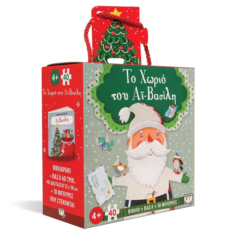 Ανακαλύψτε μέσα στο κουτί ένα βιβλιαράκι με πολλές γιορτινές εικόνες και μάθετε να τις συσχετίζετε, παρέα με τον Αϊ-Βασίλη, με τα σχήματα, τα χρώματα, τους αριθμούς και με πολλές λεξούλες. Στη συνέχεια συναρμολογήστε το παζλ και τοποθετήστε επάνω τις 10 φιγούρες από το χωριό του Αϊ-Βασίλη ή παίξτε χωριστά με αυτές!