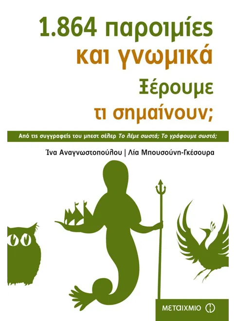 Το χρηστικό βιβλίο 1.864 παροιμίες και γνωμικά, Ξέρουμε τι σημαίνουν; από την Ίνα Αναγνωστοπούλου και τη Λία Μπουσούνη-Γκέσουρα, συγγραφείς του μπεστ σέλερ Το λέμε σωστά; Το γράφουμε σωστά;. Οι παροιμίες και τα γνωμικά αποτελούν λαϊκό δημιούργημα με διαχρονική αξία, πρέπει όμως να γνωρίζουμε το νόημά τους και, επομένως, την περίσταση στην οποία μπορούν να χρησιμοποιηθούν. Μας βοηθούν να σκεφτούμε, μας διδάσκουν το δίκαιο και το σωστό, μας παρηγορούν και μας διασκεδάζουν, αλλά συχνά περιπαίζουν και γελοιοποιούν «ασθενείς» κοινωνικές ομάδες.