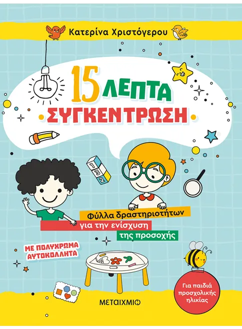 Ένα απολαυστικό βιβλίο με έγχρωμη εικονογράφηση και ευχάριστες δραστηριότητες για την άσκηση των δεξιοτήτων των μικρών παιδιών και τη βελτίωση της συγκέντρωσής τους (αντιμετώπιση της διαταραχής ελλειμματικής προσοχής – ΔΕΠ/Υ).